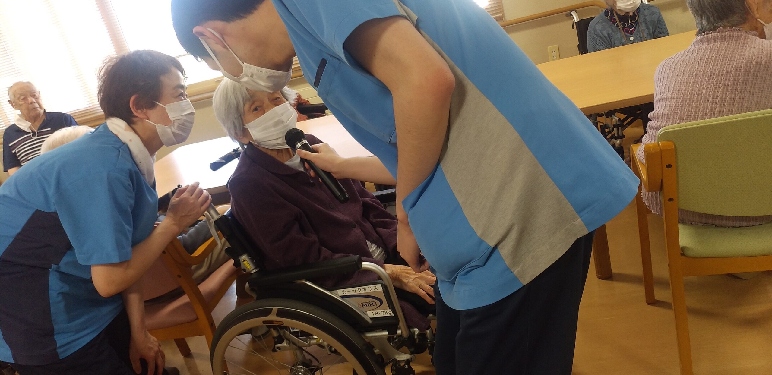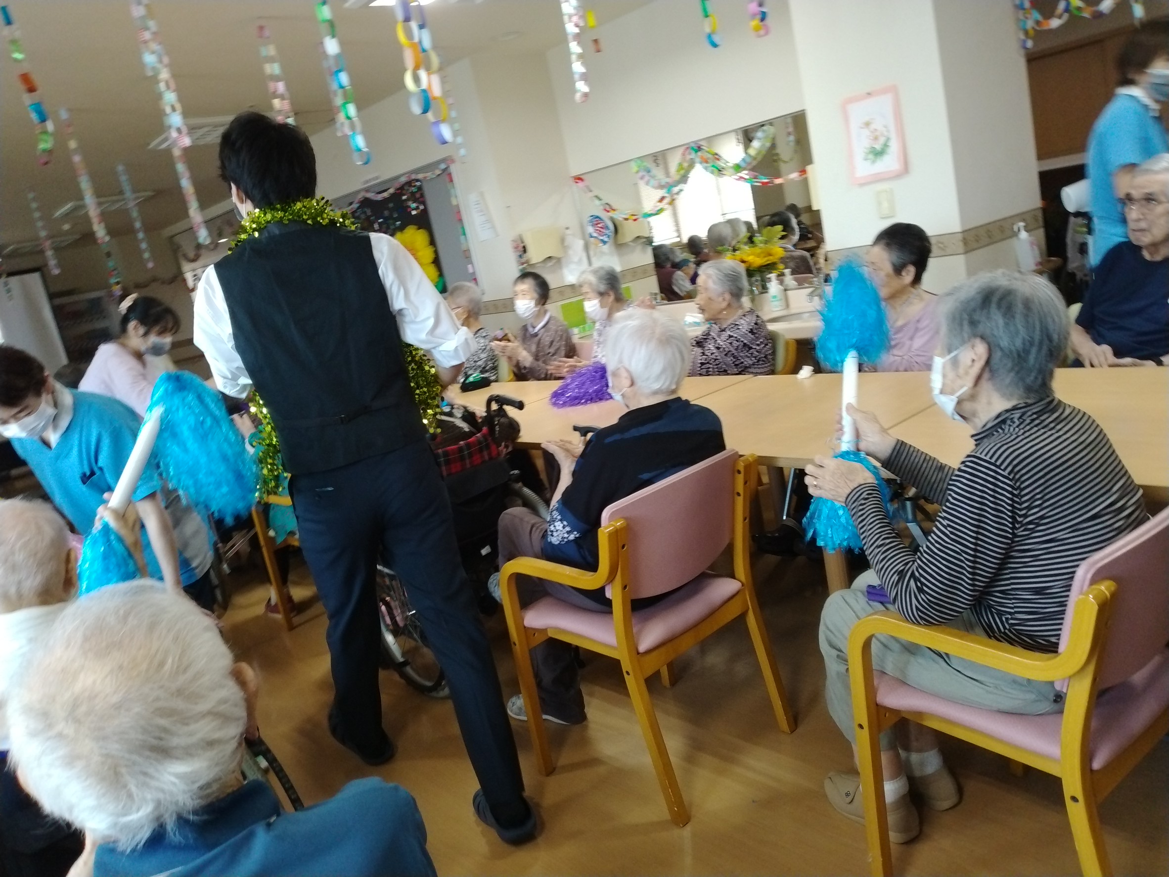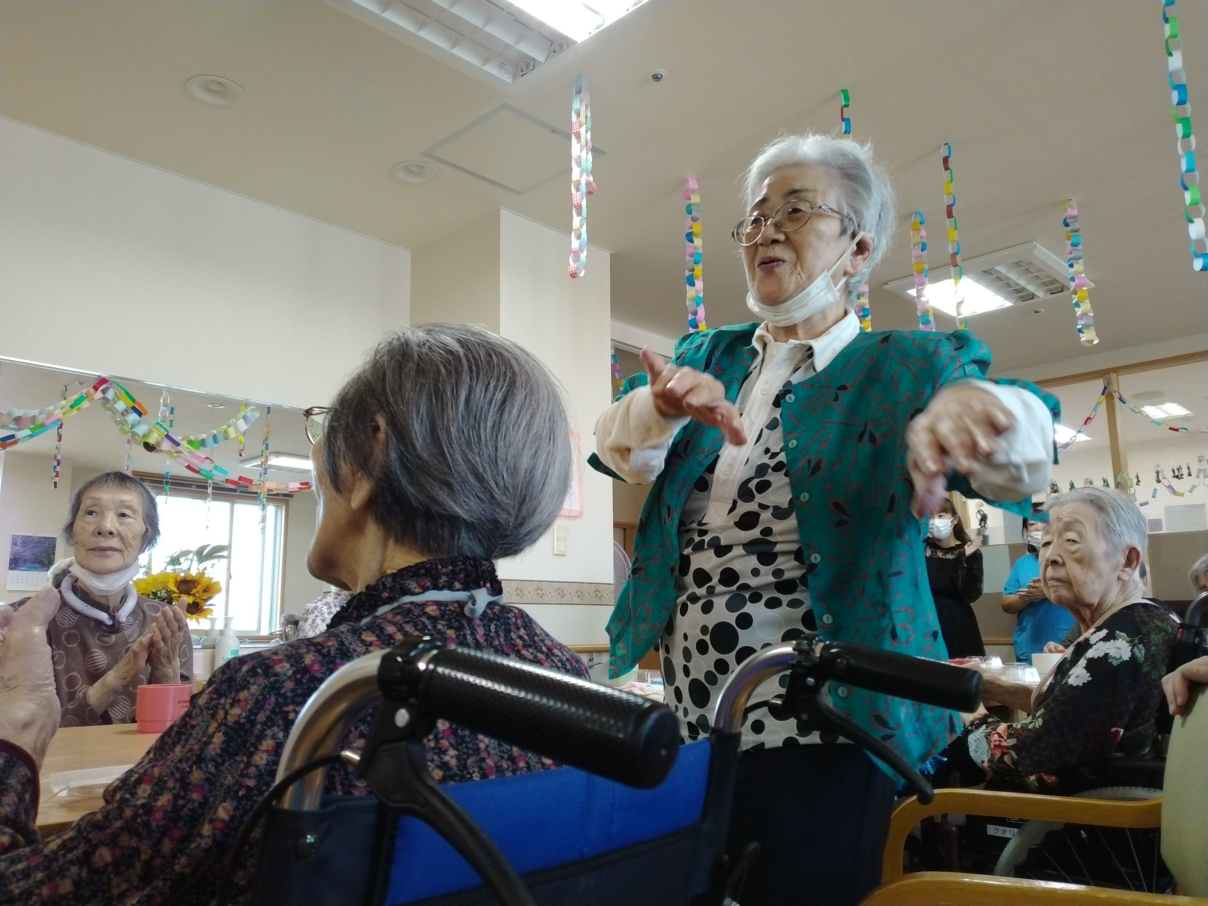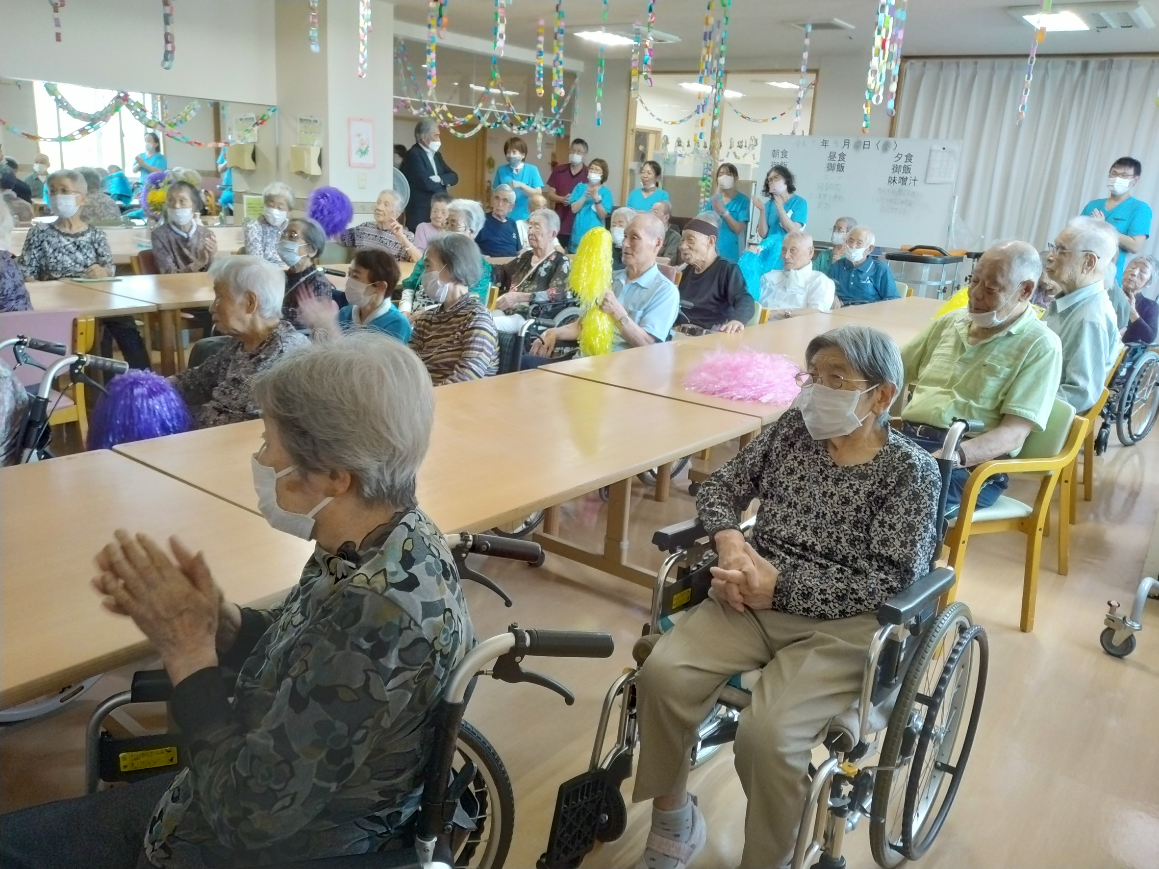 ご利用者様のご長寿をお祝いし、またこれからも一緒に元気で笑い合って過ごせますようにと、職員心を込めて余興をさせていただきました。皆さん緊張している職員を応援してくださっていました。←結局私たちが反対に元気をもらっている(笑)