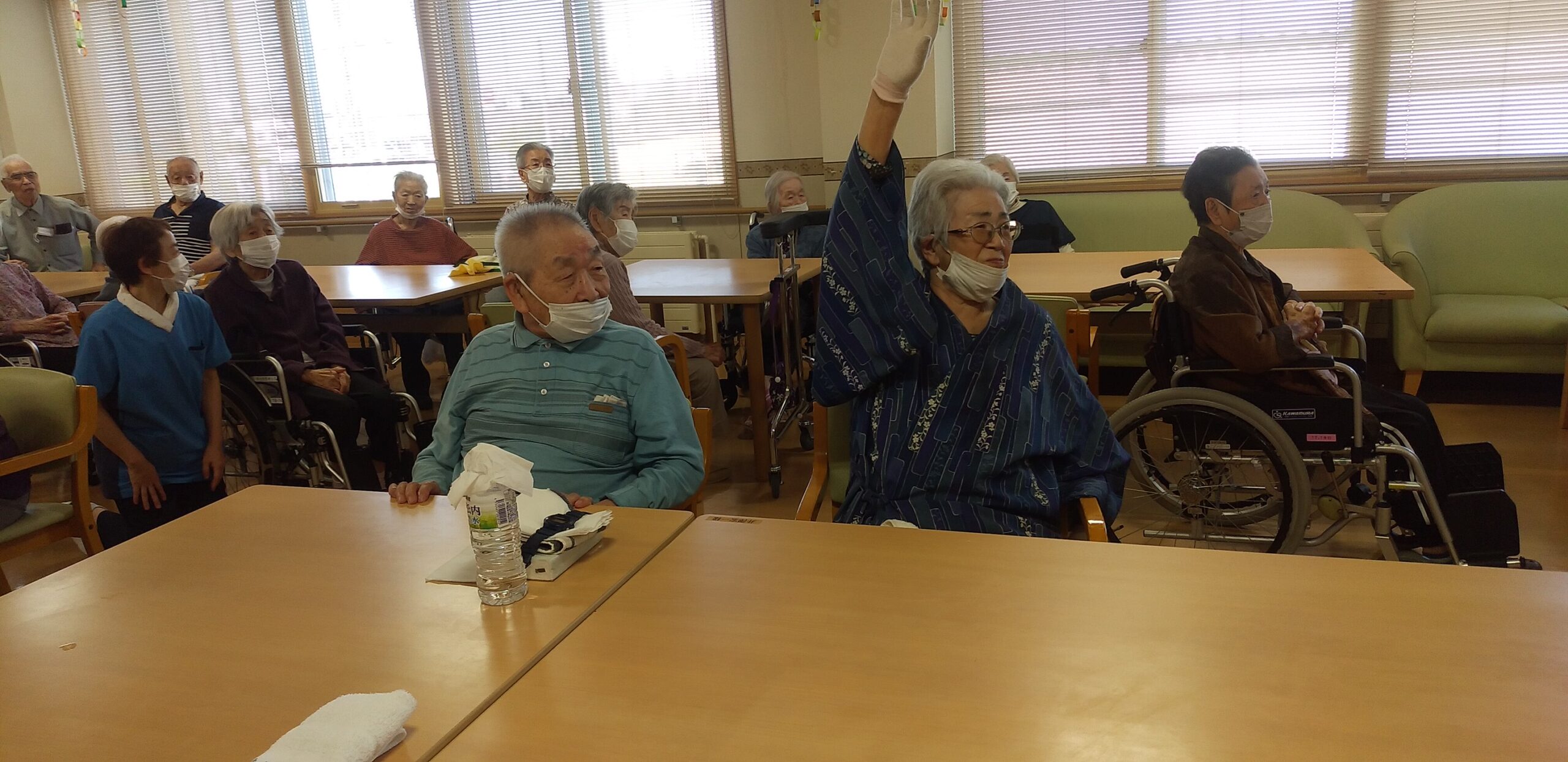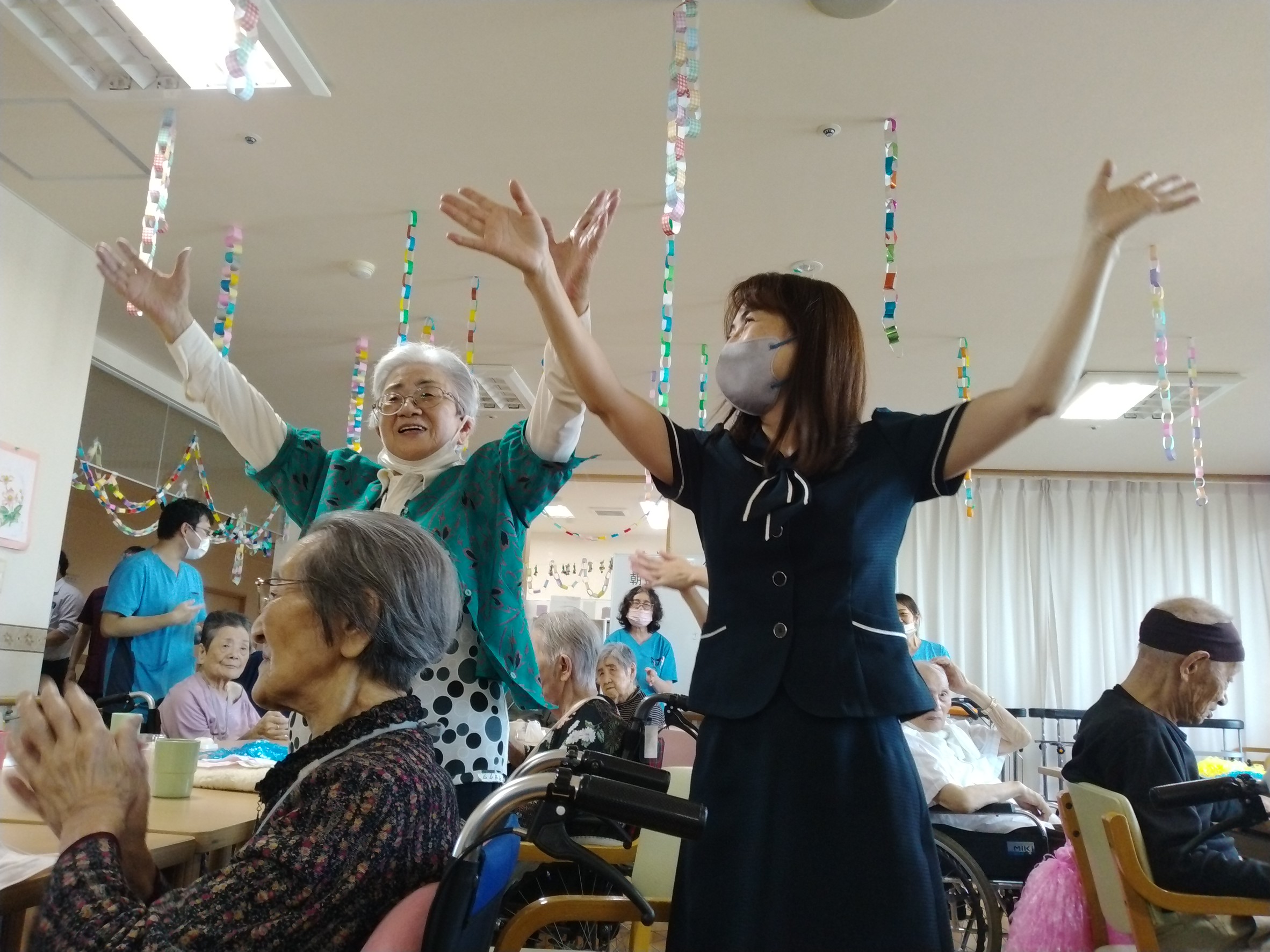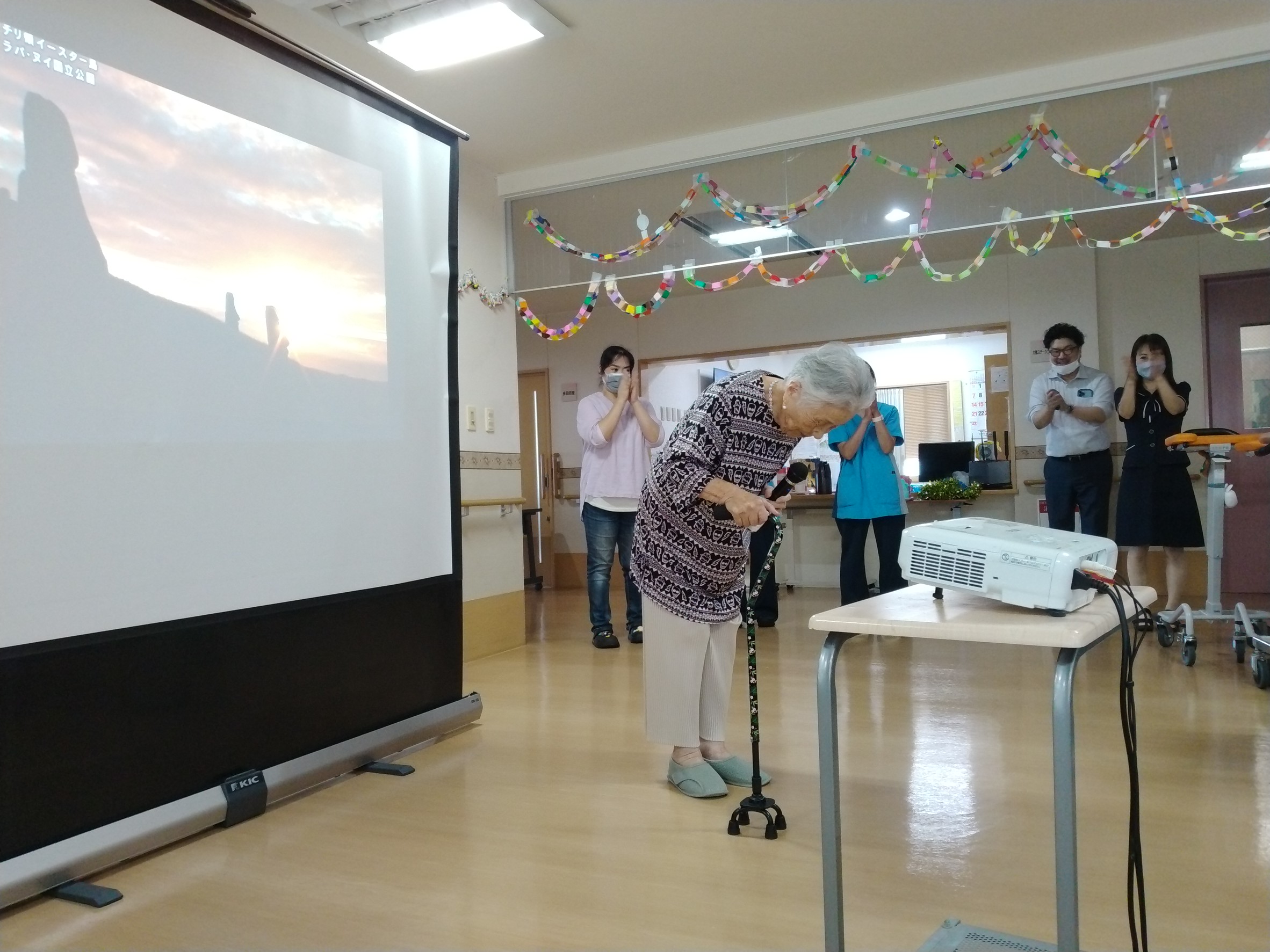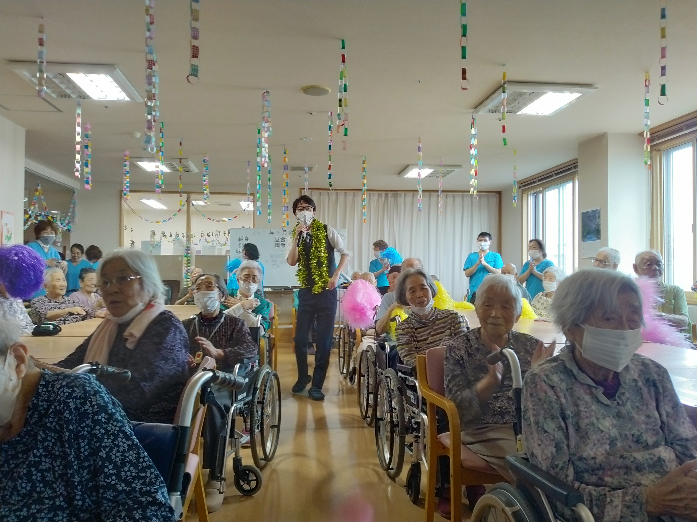 ご利用者様のご長寿をお祝いし、またこれからも一緒に元気で笑い合って過ごせますようにと、職員心を込めて余興をさせていただきました。皆さん緊張している職員を応援してくださっていました。←結局私たちが反対に元気をもらっている(笑)