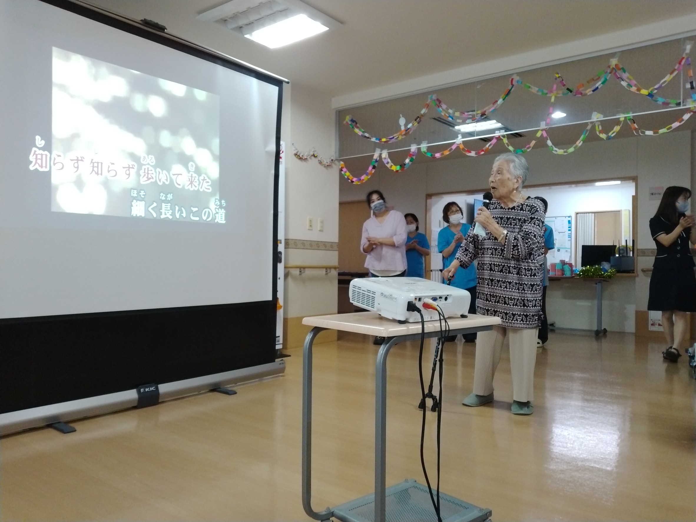 先日ご入居下さったばかりのY様。Y様は施設外のカラオケサークルに所属していまして、職員からの急なお願いにもかかわらず美空ひばりの「川の流れのように」をご披露くださいました。歌声に張りがあり、皆さんを魅了する抑揚と表現力・・・小柄なお身体のどこからそのパワーが出るのかしら~とうっとりされていました✨