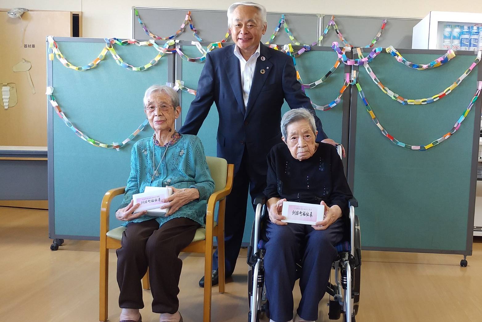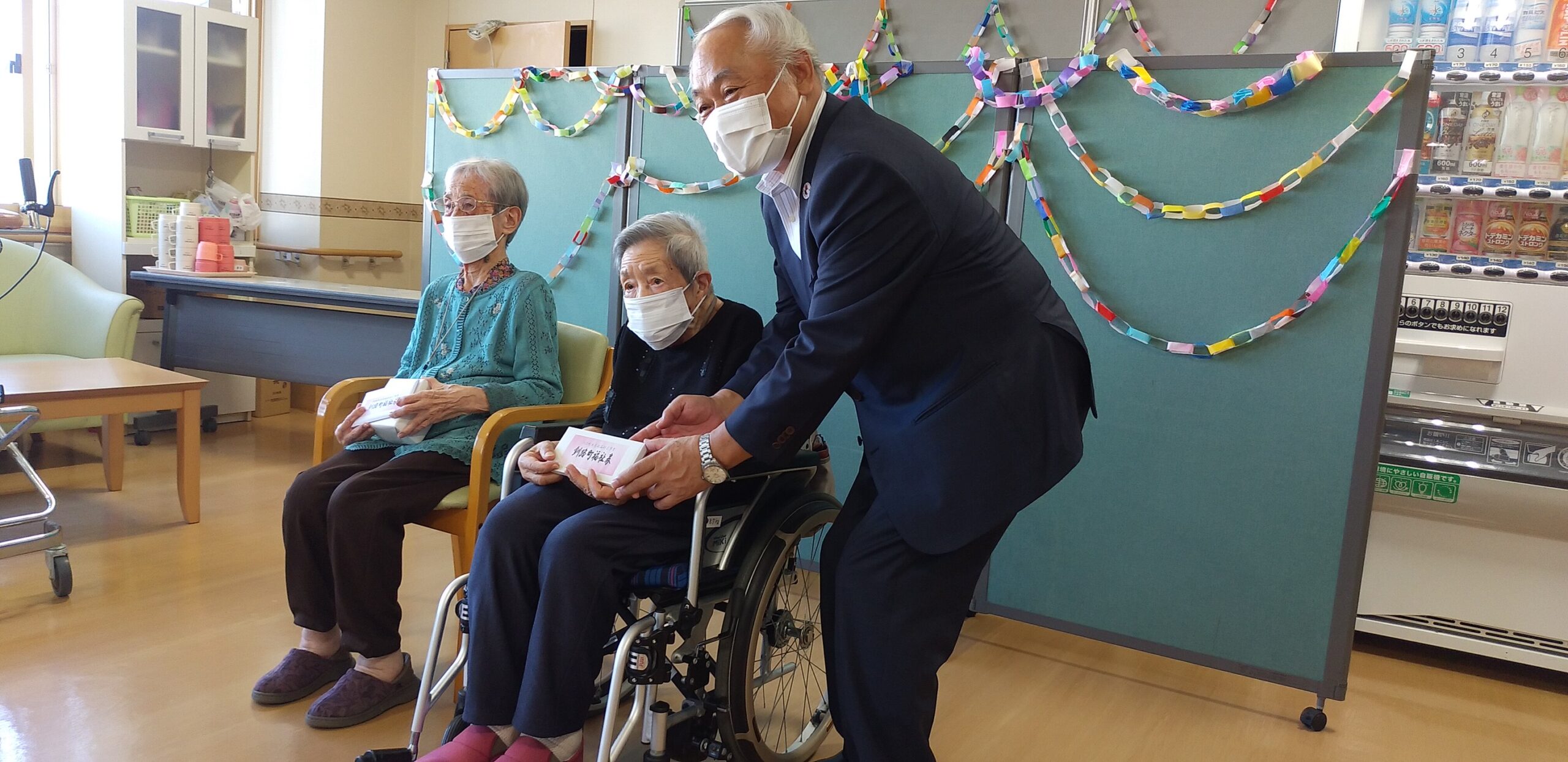 そして、今年度釧路町から長寿の表彰を受けた利用者様は2名おられ、釧路町小松町長から直接お祝いの言葉と祝い品の贈呈を受けました。O様は99歳で初めて受賞を受け大変緊張されていました。F様は103歳。なんとこの釧路町で一番のご長寿なんだそう!小松町長もF様の肌艶に驚かれていました。F様とO様おめでとうございます!